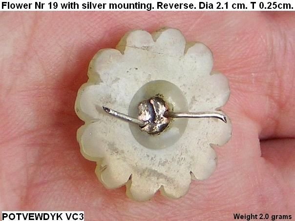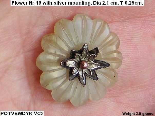 Small jade flower with a silver mounting and a small red stone in the centre. No remains of kingfisher feathers. This type of flower is not depicted in professor Cheng Te-k’un’s book ‘Jade Flowers and Floral Patterns in Chinese Decorative Art ‘.