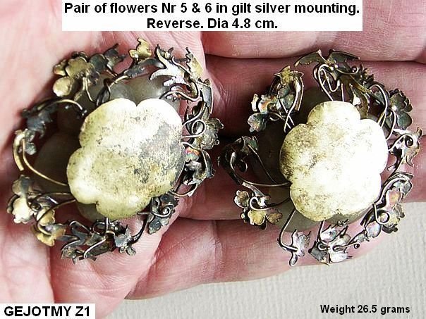 Pair of jade flowers set in gilt silver mountings with some kingfisher feathers remaining and a pink stone in the centre. A similar type of flower (nr 4) is depicted in professor Cheng Te-k’un’s book ‘Jade Flowers and Floral Patterns in Chinese Decorative Art’。