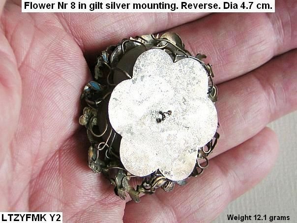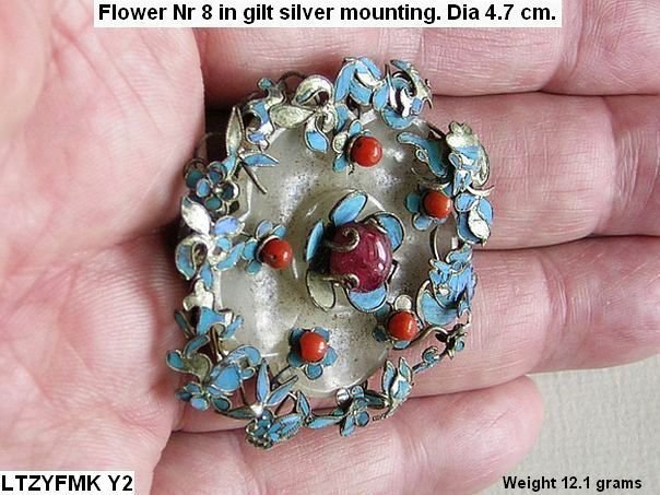 Jade flower set in a gilt silver mounting embellished with kingfisher feathers, red beads and a purplish stone in the centre. A similar type of flower (nr 100) is depicted in professor Cheng Te-k’un’s book ‘Jade Flowers and Floral Patterns in Chinese Decorative Art’。