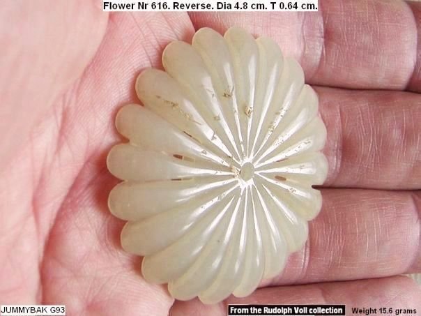 Well-carved chrysanthemum flower. The flower was previously in the possession of Rudolph Voll (1911-2009) who acquired it in the 1970’s in Hong Kong. For further information about Rudolph Voll see Quick Find 5139. An almost identical flower (nr 137) is depicted in professor Cheng Te-k’un’s book ‘Jade Flowers and Floral Patterns in Chinese Decorative Art’。