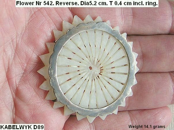 This is a truly exceptional flower. We have never seen one with three circles from the centre. A silver attachment ring is on the back. This type of flower is not depicted in professor Cheng Te-k’un’s book ‘Jade Flowers and Floral Patterns in Chinese Decorative Art ‘.