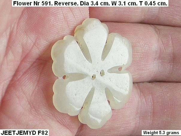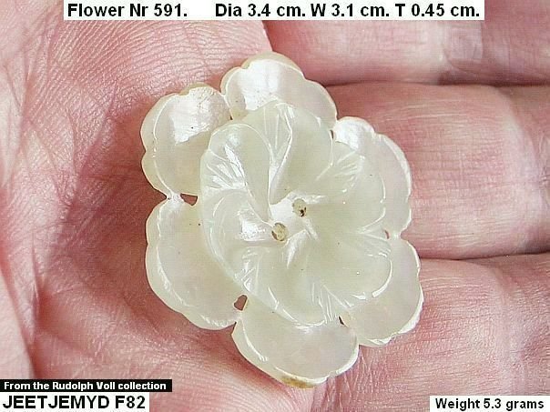 Double flower carved from a translucent white jade. The flower was previously in the possession of Rudolph Voll (1911-2009) who acquired it in the 1970’s in Hong Kong. For further information about Rudolph Voll see Quick Find 5139. An almost identical flower (nr 148) is depicted in professor Cheng Te-k’un’s book ‘Jade Flowers and Floral Patterns in Chinese Decorative Art’。