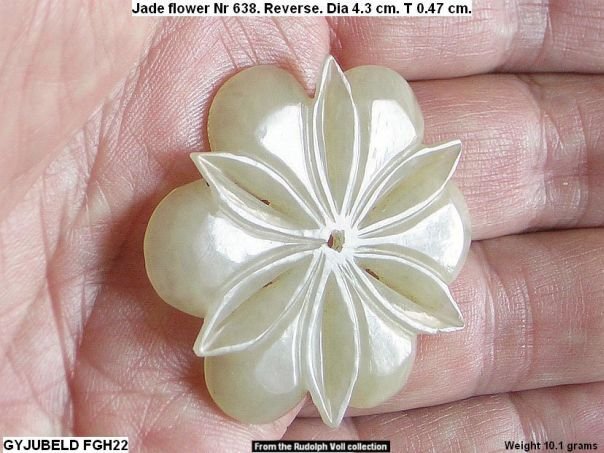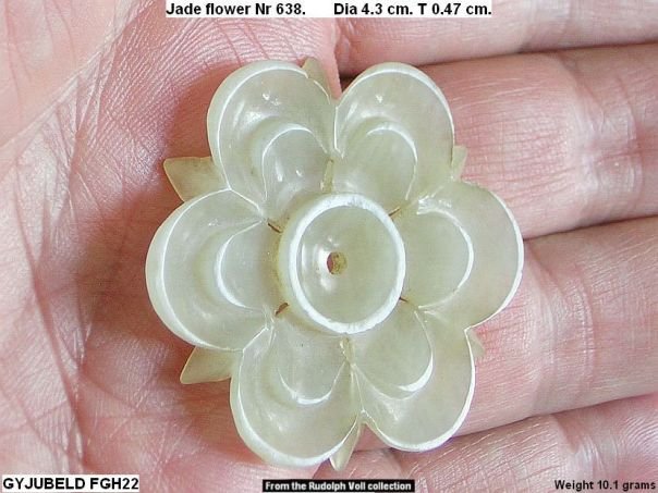 Flower with six sepals which was carved from a very light celadon jade. The back Is almost as beautiful as the front. The flower was previously in the possession of Rudolph Voll (1911-2009) who acquired it in the 1970’s in Hong Kong. For further information about Rudolph Voll see Quick Find 5139. An almost identical flower (nr 186) is depicted in professor Cheng Te-k’un’s book ‘Jade Flowers and Floral Patterns in Chinese Decorative Art’。
