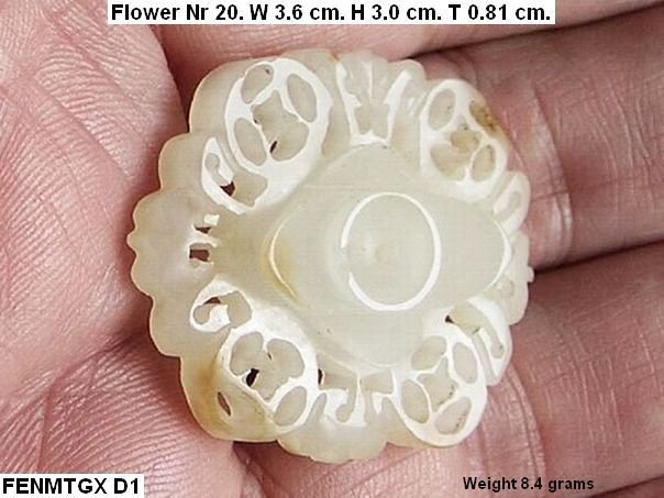 Flower consisting of four coins symbolizing good fortune. This type of flower is not depicted in professor Cheng Te-k’un’s book ‘Jade Flowers and Floral Patterns in Chinese Decorative Art’.