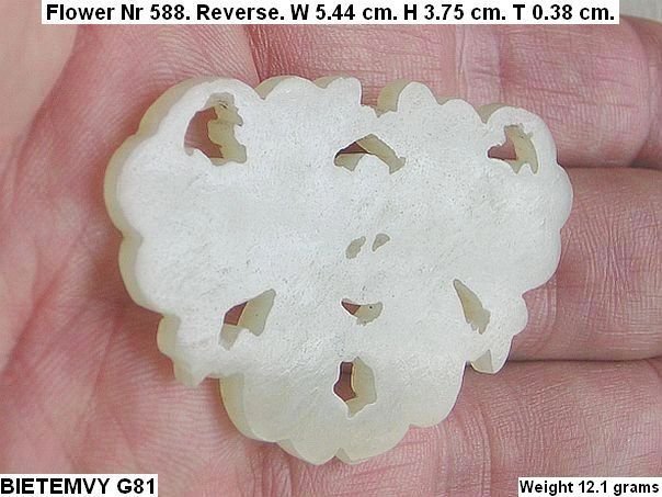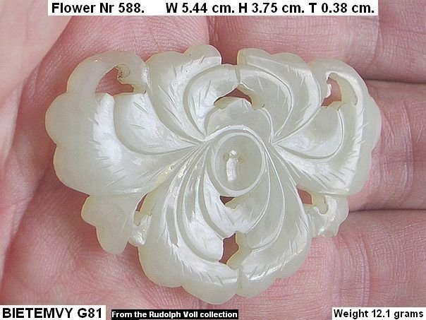 Openwork flower of very good quality. The flower was previously in the possession of Rudolph Voll (1911-2009) who acquired it in the 1970’s in Hong Kong. For information on Rudolph Voll see Quick Find 4167. A similar type of flower (nr 336) is depicted in professor Cheng Te-k’un’s book ‘Jade Flowers and Floral Patterns in Chinese Decorative Art’.