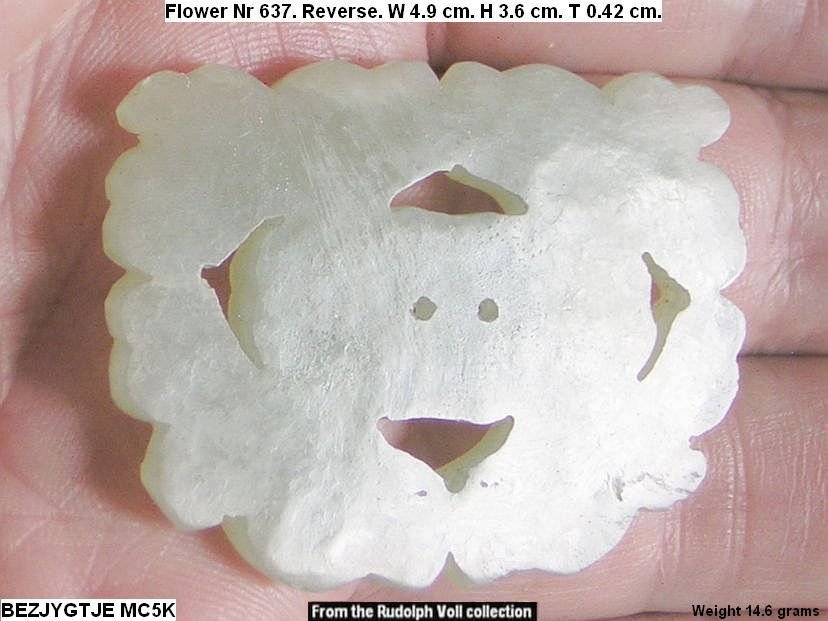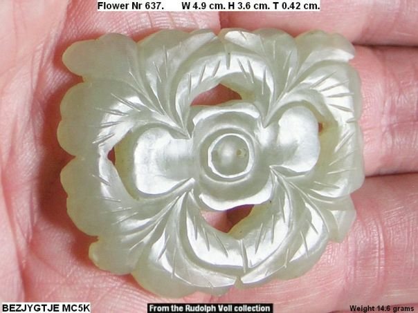 Openwork flower of very good quality. The flower was previously in the possession of Rudolph Voll (1911-2009) who acquired it in the 1970’s in Hong Kong. For information on Rudolph Voll see Quick Find 5139. This type of flower is not depicted in professor Cheng Te-k’un’s book ‘Jade Flowers and Floral Patterns in Chinese Decorative Art ‘.