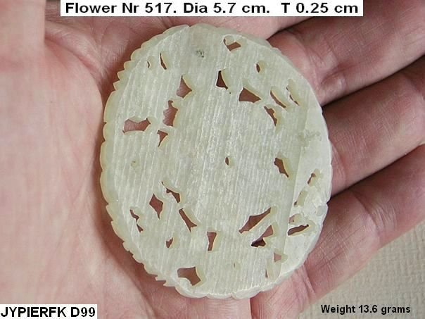 Openwork rosette with two Magpies (xique) and Plum blossoms (mei) which are a hidden meaning for the expression ’ May your joy reach up to the level of your eyebrows’ (xishang meishao). Also depicted are a Box (Treasures) with a Lingzhi fungus (Longevity) and a Chrysanthemum flower, another symbol of Longevity because of its health giving properties. This type of flower is not depicted in professor Cheng Te-k’un’s book ‘Jade Flowers and Floral Patterns in Chinese Decorative Art ‘.