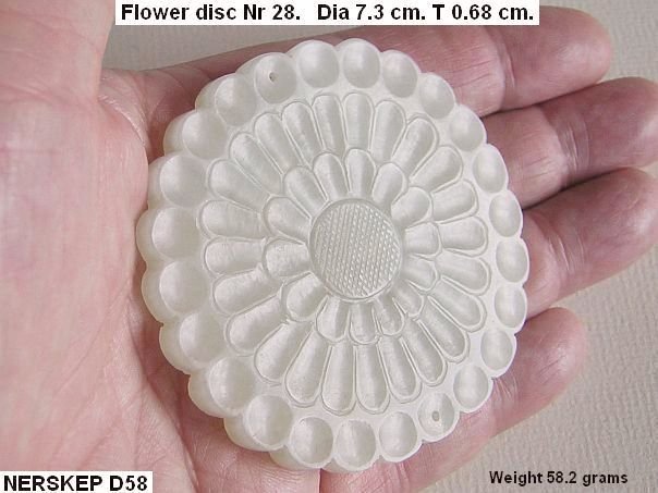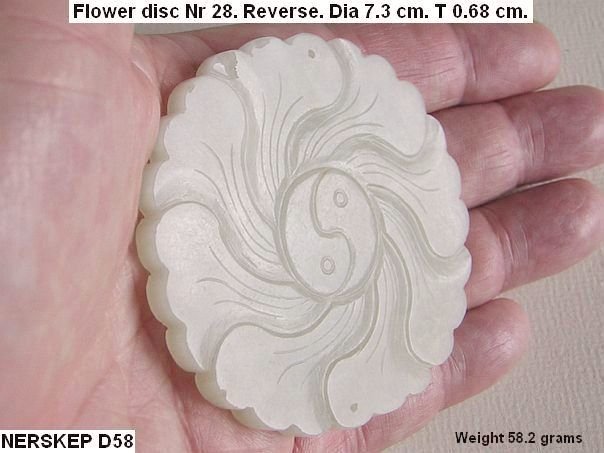 Flower-shaped disc without holes in the Ying Yang symbol as with most other discs. Instead it has two pin-sized holes which have been drilled from front to back. A similar type of flower (nr 405) is depicted in professor Cheng Te-k’un’s book ‘Jade Flowers and Floral Patterns in Chinese Decorative Art’。
