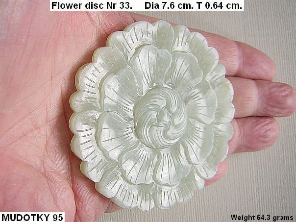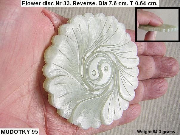 Beautifully carved disc in the shape of a Peony flower symbolizing Wealth & Honor. It always surprises us that many of these large discs have natural cracks. This is the result of a shortage of good material during the end of the Ming period (1368 – 1644 AD). During the Qing period (1644 – 1912 AD) the Silk Road became again safe to travel and the amount of good quality jade increased tremendously. This disc has the usual eight overlapping petals and a Yin Yang symbol on its back. Two pin-sized holes have been drilled into the rim for additional attachment. This type of flower is not depicted in professor Cheng Te-k’un’s book ‘Jade Flowers and Floral Patterns in Chinese Decorative Art ‘.
