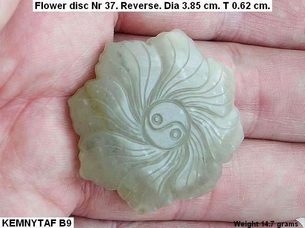 Small flower-shaped disc with very fine carving. There are no holes in the Ying Yang symbol as with most other discs. Two pin-sized holes have been drilled into the rim for attachment. This type of flower is not depicted in professor Cheng Te-k’un’s book ‘Jade Flowers and Floral Patterns in Chinese Decorative Art ‘.