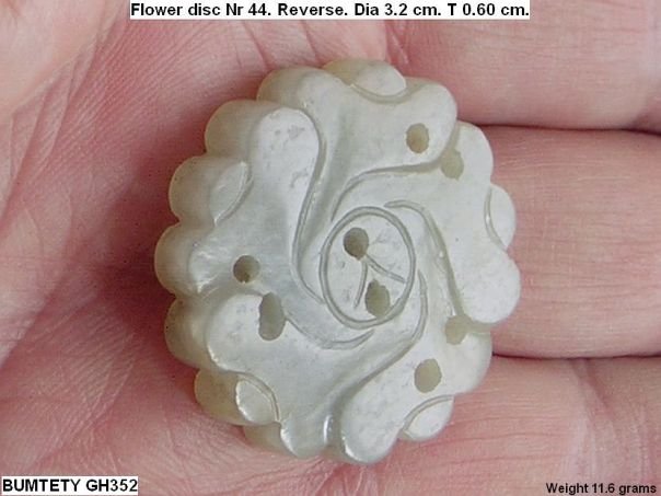 The back of this small flower-shaped disc looks like a Swiss cheese with no less than eight holes for attachment. This type of flower is not depicted in professor Cheng Te-k’un’s book ‘Jade Flowers and Floral Patterns in Chinese Decorative Art ‘.