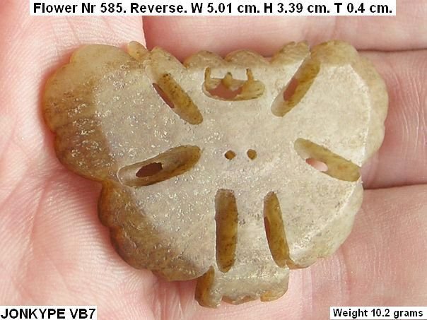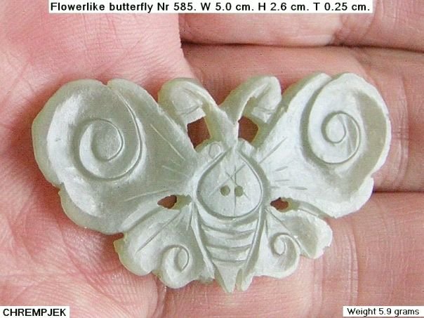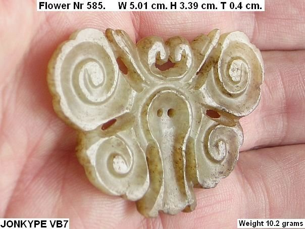 Jade flower which has the characteristics of both a flower and a butterfly. Just compare it to the last two photos which show a butterfly. Despite the likeness, it still is a flower of the ‘Grooved’ type. The discoloration shows that the flower came out off the ground. This type of flower is not depicted in professor Cheng Te-k’un’s book ‘Jade Flowers and Floral Patterns in Chinese Decorative Art ‘.