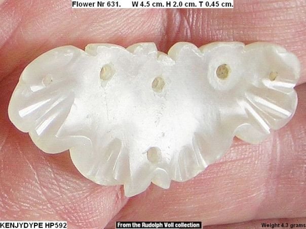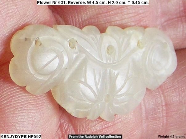 A long time ago this flower broke and the back side was later re-carved as a water chestnut. Jade was a precious stone and nothing went to waste if a jade object was damaged. The object was previously in the possession of Rudolph Voll (1911-2009) who acquired it in the 1970’s in Hong Kong. For further information about Rudolph Voll see Quick Find 5139. A similar type of flower (nr 428) is depicted in professor Cheng Te-k’un’s book ‘Jade Flowers and Floral Patterns in Chinese Decorative Art’。