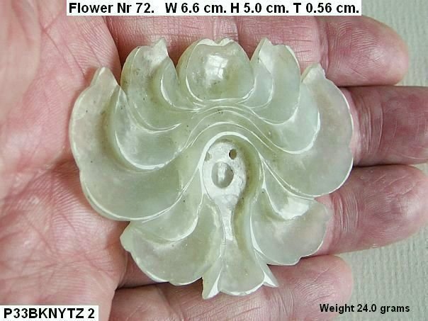 Flowers of this large size are rare. We were lucky to find a small number of them for our collection. A similar type of flower (nr 319) is depicted in professor Cheng Te-k’un’s book ‘Jade Flowers and Floral Patterns in Chinese Decorative Art’。