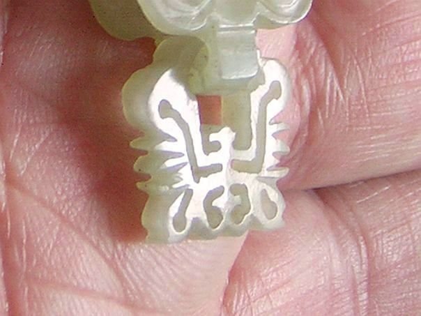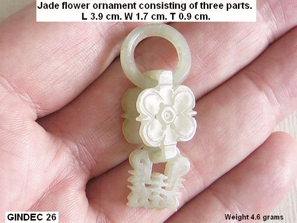 Jade ornament consisting of three parts. Usually these ornaments come in pairs. This one consists of a ring, a flower and a Longevity-character. It dates from the Qing period (1644 – 1912).