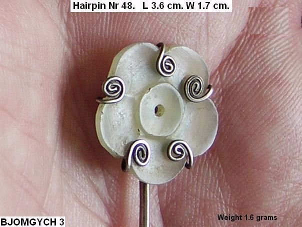 Celadon colored jade rosette attached with five coiled clamps to a single-pronged short silver hairpin. A similar type of flower (nr 92) is depicted in professor Cheng Te-k’un’s book ‘Jade Flowers and Floral Patterns in Chinese Decorative Art’。