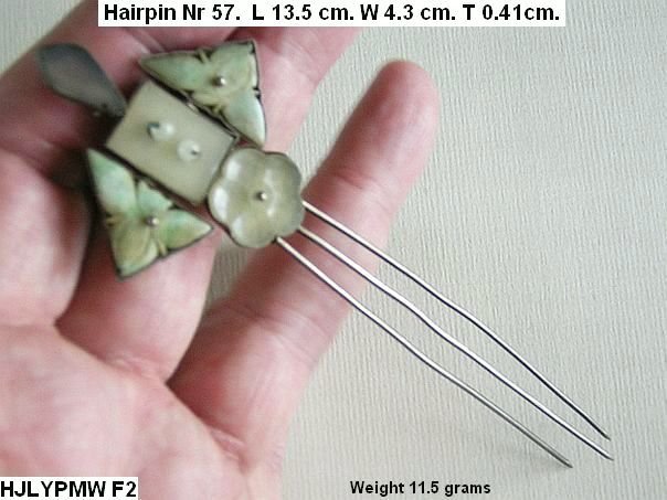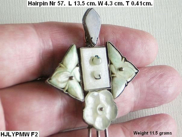 Two jadeite flowers, a nephrite flower and two other pieces of jade decorate this hairpin. The top piece was originally dyed in a vivid green but the dye has faded away in the sunlight.
