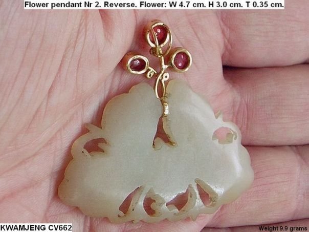 Well-carved celadon colored openwork jade flower mounted in a 18K gold setting embellished with eleven tiny diamonds and three cabochon rubies. Just like in the old days, it has become a fashion in China to re-use antique jade flowers in modern jewelry. The flower dates from the Ming period (1268 - 1644) whereas the setting was made by a goldsmith in Shanghai in 2013. It entered the Lowlands-collection in 2016. A similar type of flower (nr 337) is depicted in professor Cheng Te-k’un’s book ‘Jade Flowers and Floral Patterns in Chinese Decorative Art’.