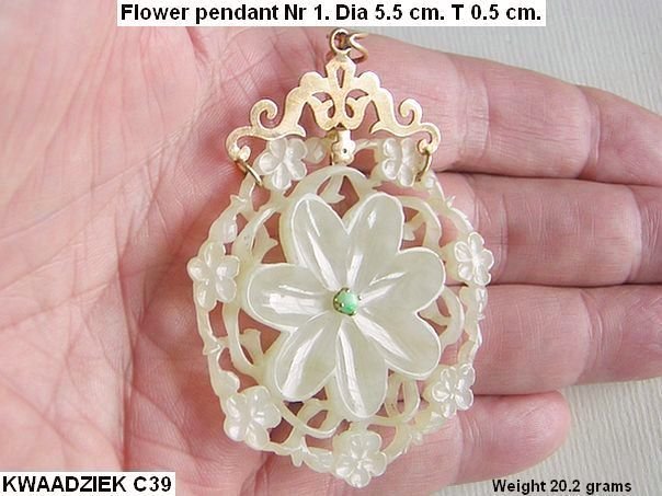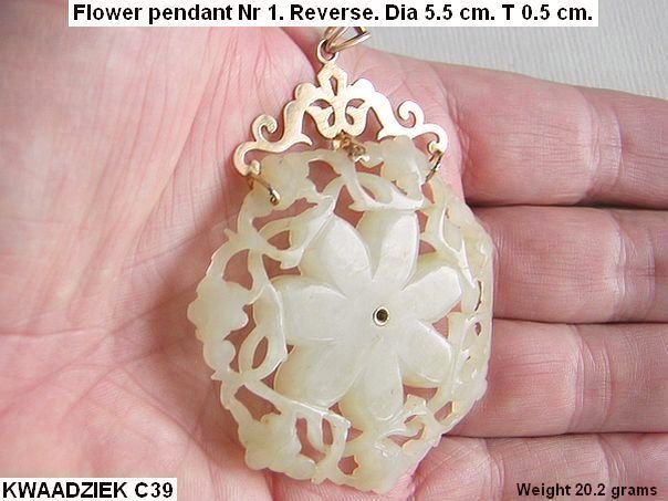 Stunning openwork jade pendant consisting of one large seven-petaled flower and seven smaller ones all connected by thin tendrils. The flower is attached to a 14K gold pendant-setting. In the centre of the large flower is a small jadeite cabochon. The pendant came from America and was most probably made in the 1950's. This type of flower is not depicted in professor Cheng Te-k’un’s book ‘Jade Flowers and Floral Patterns in Chinese Decorative Art ‘.