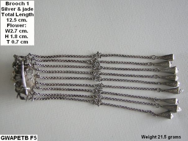 Silver brooch mounted with a three-decked celadon colored flower. Nine delicate thin chains are attached to the brooch. The brooch came from Fujian province in China and the silver setting dates from around 1900. A similar type of flower (nr 252) is depicted in professor Cheng Te-k’un’s book ‘Jade Flowers and Floral Patterns in Chinese Decorative Art’.