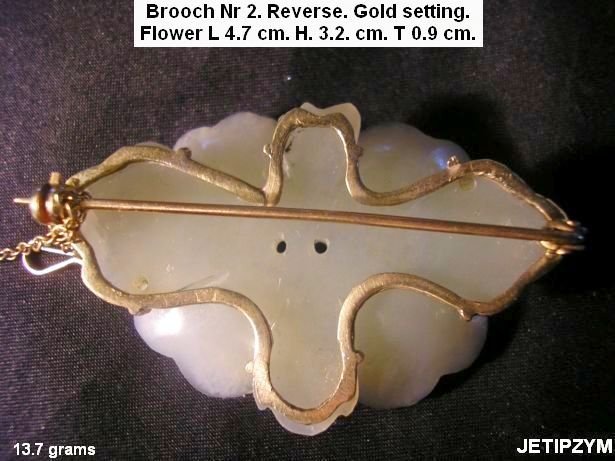 Gold brooch set with a three-decked white jade flower. The brooch came from England and the gold setting was most probably made in the 1970’s. A similar type of flower (nr 252) is depicted in professor Cheng Te-k’un’s book ‘Jade Flowers and Floral Patterns in Chinese Decorative Art’.