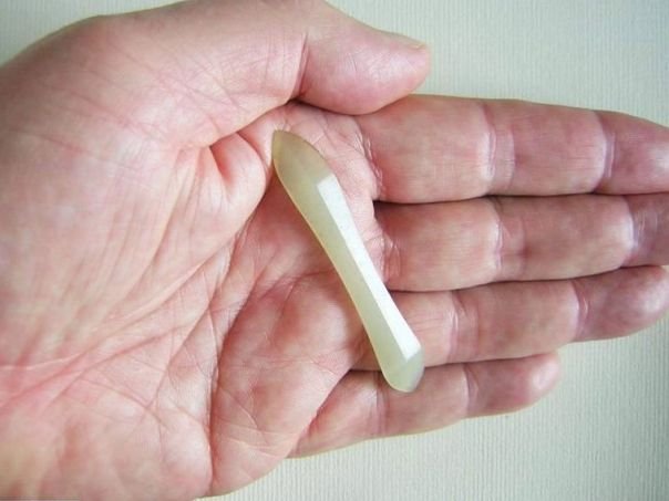 Very small celadon colored hairpin. The top side is carved in the shape of two beveled planes. The hairpin was added to the collection from Taipei in 1985. It dates from the Qing dynasty (1644 - 1912). Length 6.8 cm. Width at tips 1.0 cm. Thick 0.31 cm.