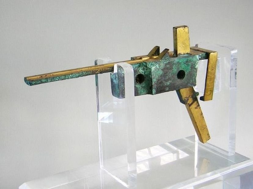 Gilt bronze mechanism which once formed the trigger part of a crossbow. The crossbow mechanism (see photo how it functioned) was a Chinese invention. This one is of exceptional quality with thick gilding. A gilt bracket has been glued to the back of the mechanism in order to prevent it from getting lost. This bracket most probably once formed part of the wooden butt. The moving parts of the mechanism are stuck together and the pins on which the parts of the mechanism used to rotate have deteriorated long ago and were most probably made of wood or bamboo. The mechanism dates from the Western Han period (206BC – 25AD). Length 21 cm. See also Quick Find 0325-2 and 0325-3 for other trigger mechanisms.