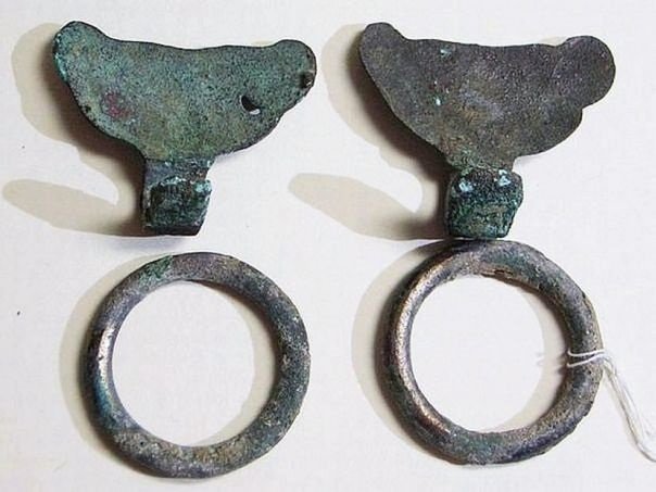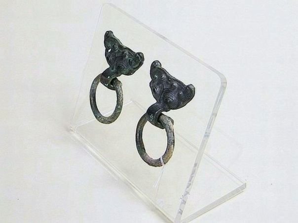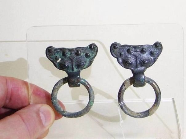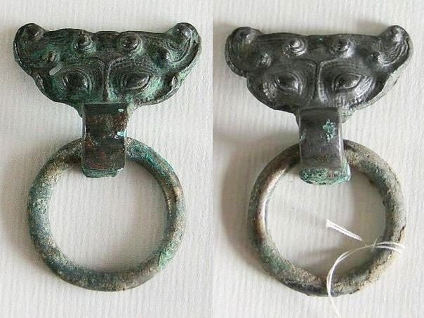 Pair of small bronze monster mask ring handles covered in whirls which places them in the Warring States period (475 – 221BC). They were originally attached to an object which deteriorated over time. One monster mask has a minor hole which occurred during the casting process. Height including rings 5.5 cm.