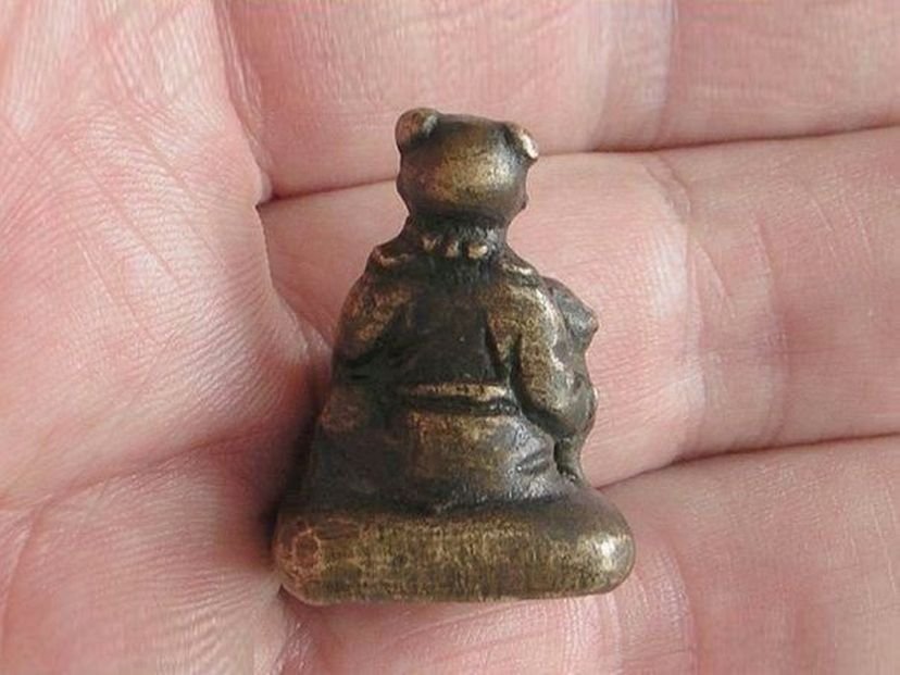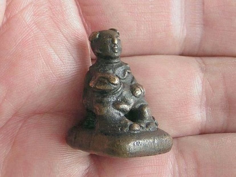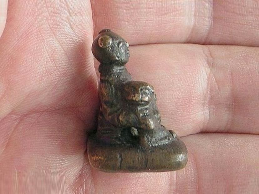 Small bronze seal in the shape of a boy with a large dog on his lap. The seal dates from the Qing period (1644 – 1912). Height 2.9 cm. Width 2.1 cm. Depth 2.1 cm.
