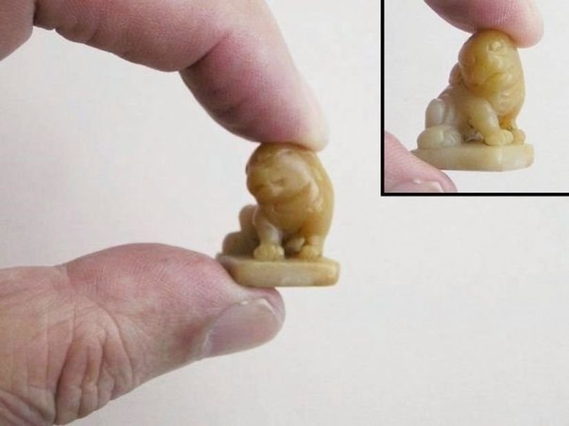 Very small shoushan stone seal topped by a Bixie. A Bixie (辟邪) is a lion-like mythological Chinese creature which is considered as an exorcising animal. The word Bixie literally means ‘Avoid Evil’. The seal has seen much use but the quality of the carving is still visible. It is not inscribed which is also due to its very small size but we believe that it may date from the early Qing period (1644 – 1912). The seal-print is very well executed. Height 2.2 cm. Width and depth 1.7 cm. Weight 7.5 grams.