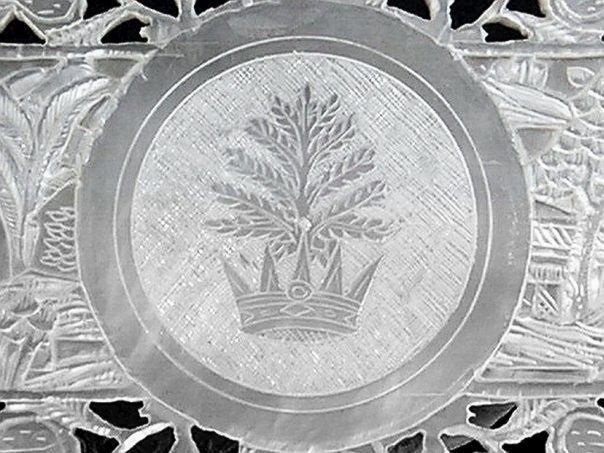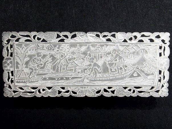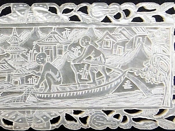 A sampan and a fishing boat approach each other. The fisherman is pulling in his net . The background is formed by a village with a pagoda in the centre. The deep-carved armorial shows an oak tree within a crown (Eastern Coronet) which may be the crest of McGarel-Hogg, Baron Magheramorne. Depicted on the left side of the crest is a dog and on the right side a bird. The intricately fretted border is decorated with flowers, fruits, scrolling leaves and on the front two butterflies, symbols of a happy marriage. The counter dates from the Daoguang period (道光 1820 – 1850). Length 6.9 cm. Height 2.7 cm. Thickness 0.28 cm.