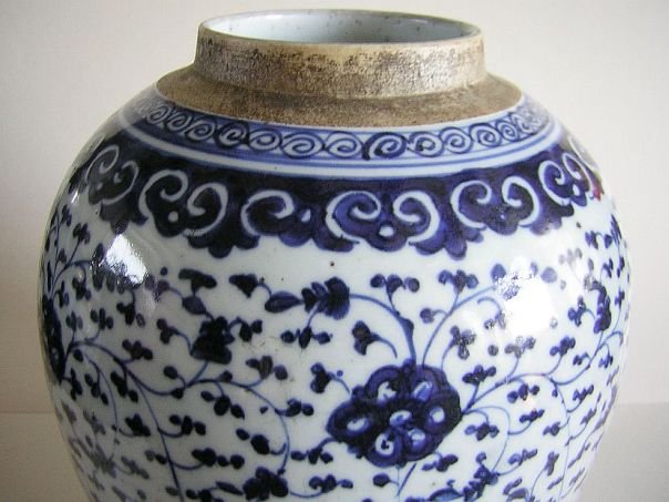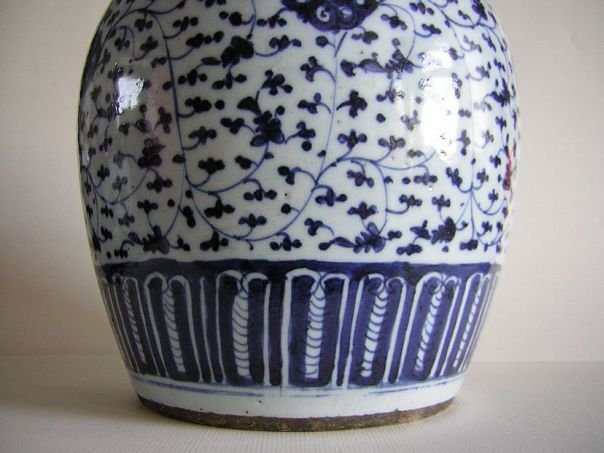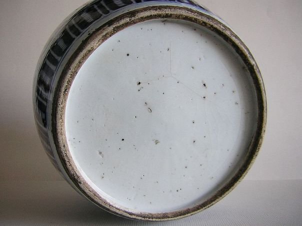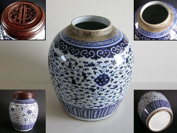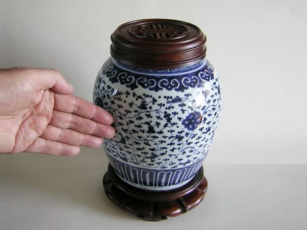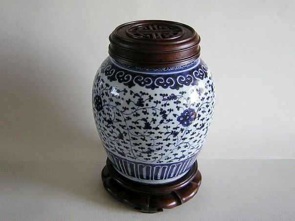 Porcelain storage jar painted in blue and white with a decoration of unknown flowers. The rim is decorated with Ruyi symbols which are a pun ‘May you get everything you wish for’. The cover is decorated with a ‘shou’ character for ‘Longevity’. The jar dates from the early Qing period (1644 – 1912) and has a hardwood cover which may be of a later date. Height including stand and cover 27 cm. Height without stand and cover 22 cm. Diameter pot 17.5 cm. Diameter base 13.5 cm.
