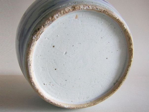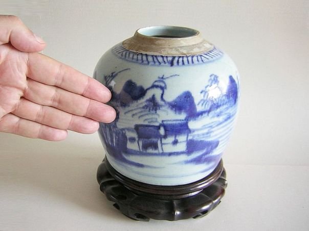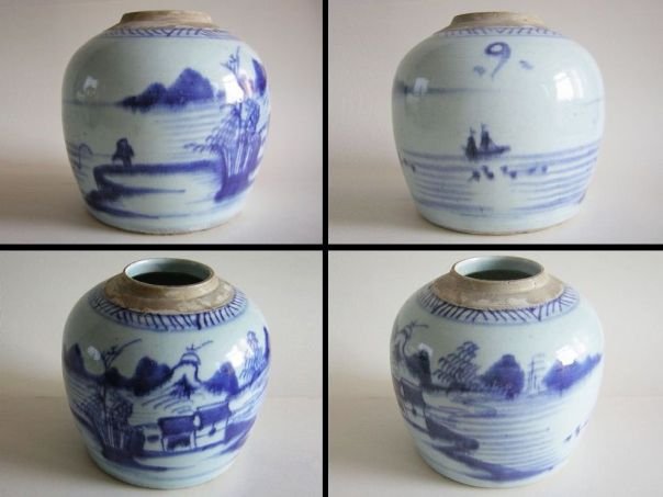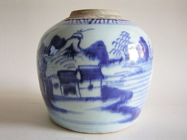 Porcelain storage jar decorated in blue and white with houses in a mountainous landscape. A figure on a river bank looks at a sailing boat. These food containers were exported from China in large numbers during the 18th and 19th centuries and are commonly known as ginger jars. Very often their porcelain lids are missing as in this case. It dates from the middle of the Qing period (1644 – 1912). Height 15.5 cm. Diameter jar 16 cm. Diameter base 14 cm.