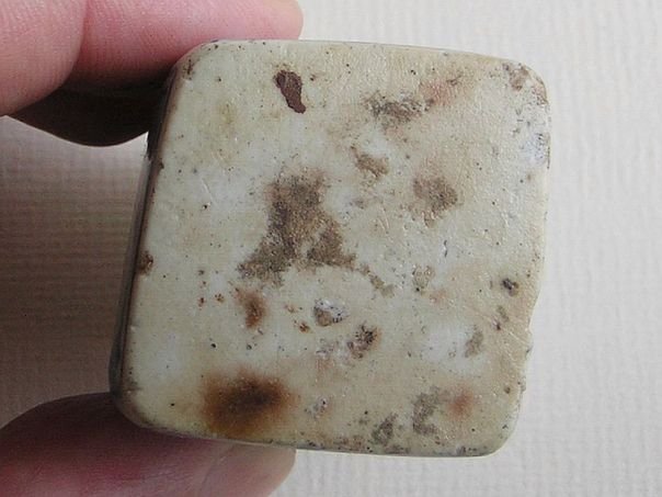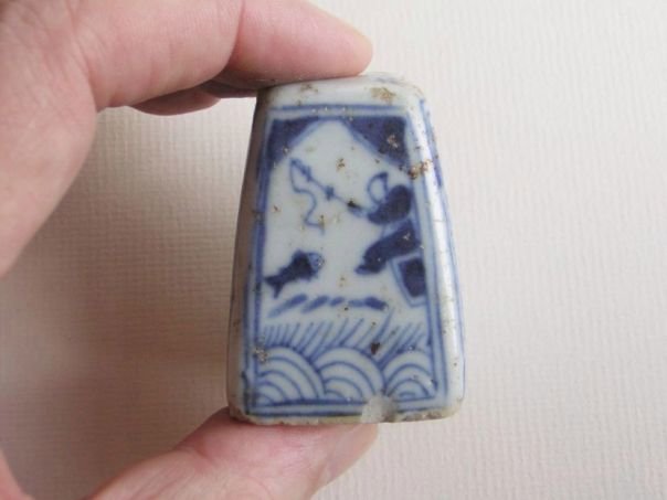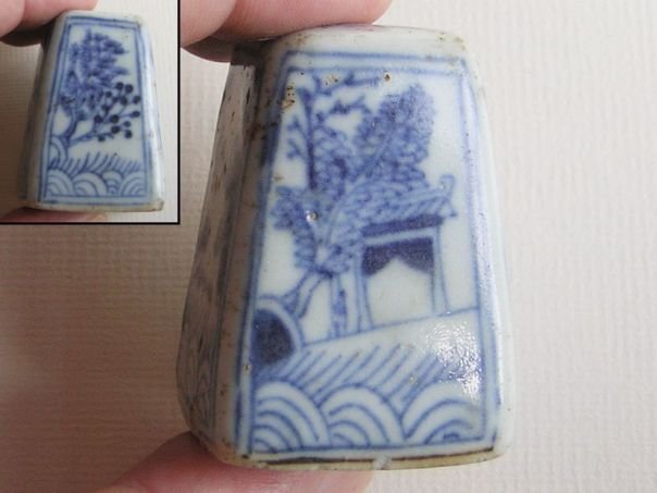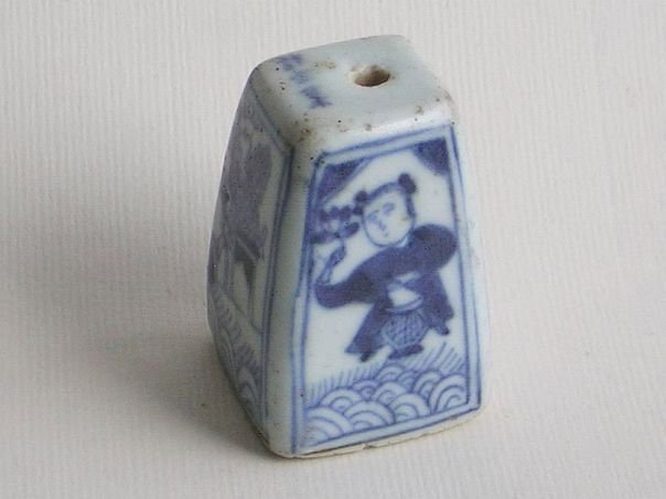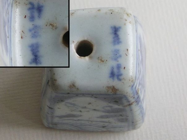 Small porcelain candle stand decorated in blue and white on each side with auspicious motives. One side shows a boy holding a lotus flower (lian) which is a pun ‘May you continuously give birth to distinguished sons’ (liangzheng guizi). One of the names for a lotus is lian which is similar to ‘continuously’ (lian). The boy represents the wish for a son. On another side is a gate. Gates were usually found in the gardens of influential men symbolizing a wish for a good career. We have no idea about the meaning of the tree which seems to have been fallen on the roof of the gate. Another side shows a man fishing. A fish (yu) represents Abundance and lots of surplus (yu). The last side shows a pine and a plum tree which are both symbols of Longevity. The candle stand is signed on the top by the artist and we believe that the signature reads Xu Jia Ye (許家葉) but the middle character is very vague and hard to decipher. The glaze shows some fritters. The stand dates from the Qing period (1644 – 1912). Height 5.2 cm. Width and depth 4.7 cm.