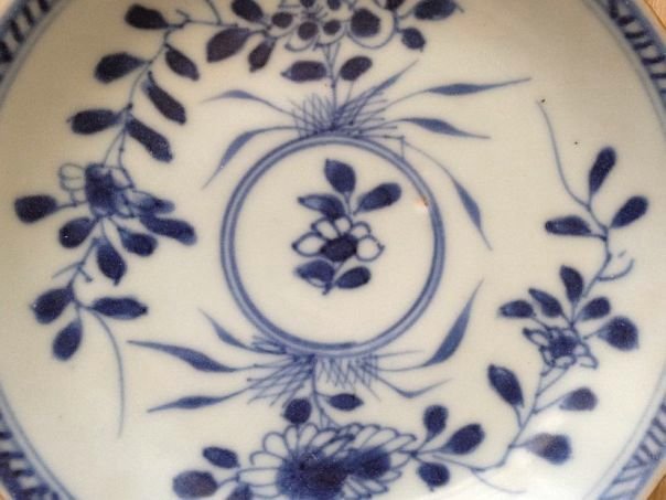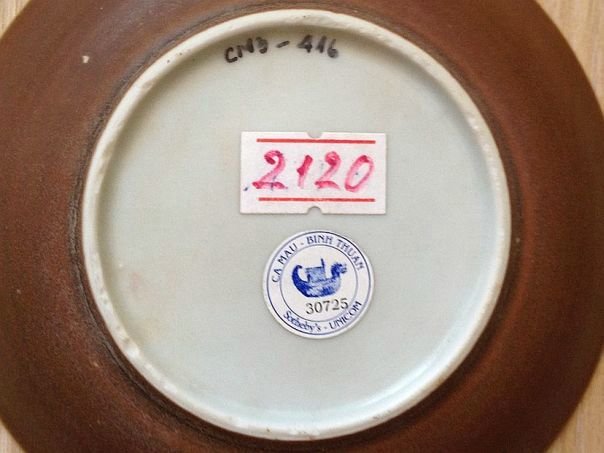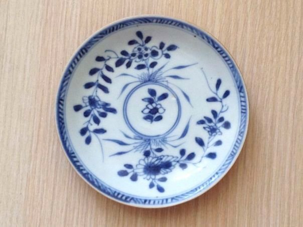 Porcelain saucer decorated in blue and white with chrysanthemum flowers which symbolize Longevity because of the health-giving qualities of the plant. The back is covered in a ‘café-au-lait’ glaze and still has a sticker stating that it was auctioned at Sotheby’s. It also has reference numbers which were added by the National Museum of Vietnamese Culture. The saucer formed part of a large haul of porcelain which was discovered in the wreck of a Chinese junk off the coast of Vietnam. Some wine cups on board bear the mark of Yongzheng who was the third emperor of the Qing Dynasty reigning from 1722 to 1735. As a result the saucer dates from around that time. Diameter 11.2 cm. Height 1.9 cm.