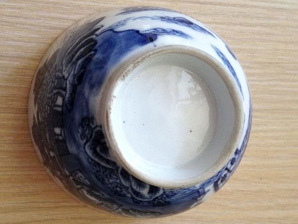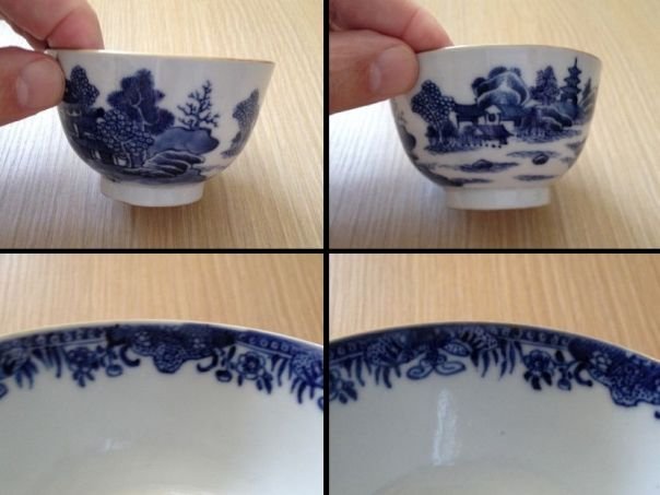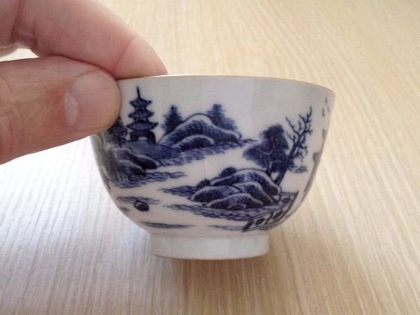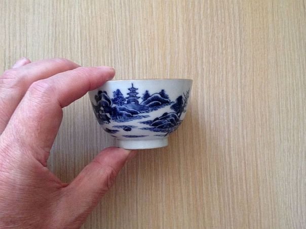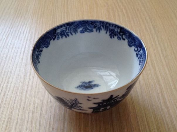 Blue and white porcelain tea bowl finely decorated with houses and a pagoda in a landscape. The rim is painted on the inside with foliage and butterflies which symbolize Blessings and Happiness. The bowl is not marked but dates from the 18th century and was made in China for the Western market. It was acquired in England. Height 4.7 cm. Diameter at the rim 7.8 cm. Diameter of the foot ring 3.7 cm.