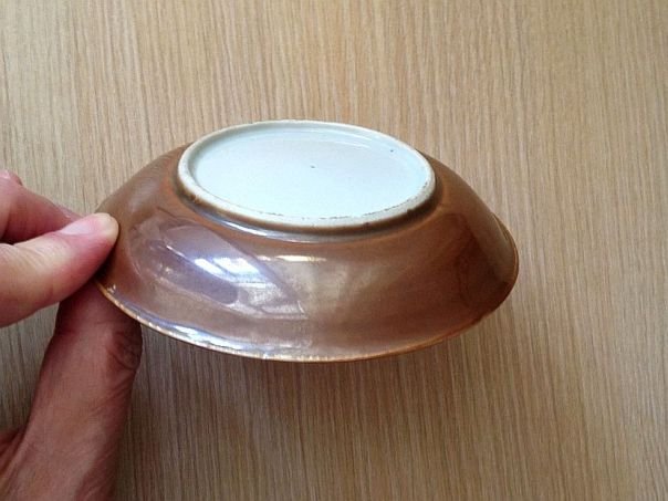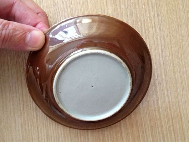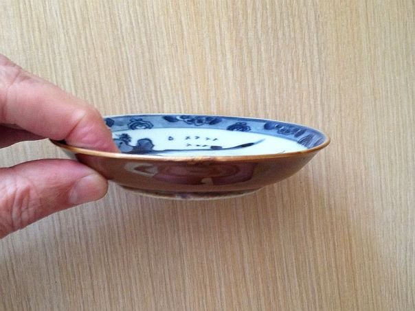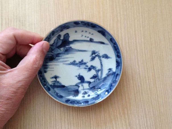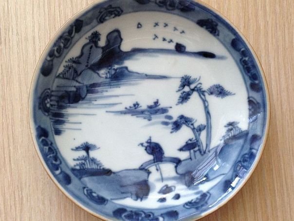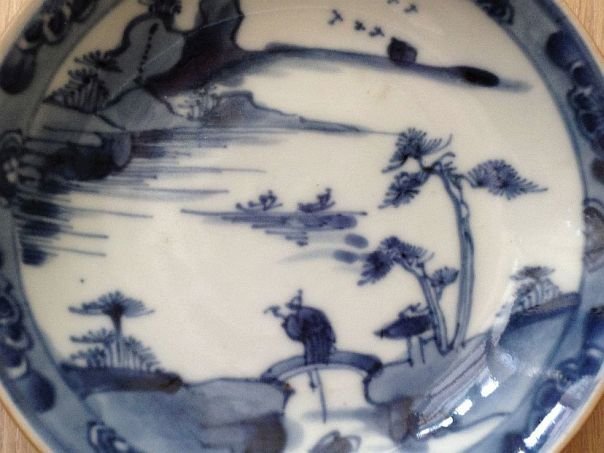 Porcelain saucer decorated in blue and white with an old man crossing a bridge in a mountainous landscape. The back is covered in a nice ‘café-au-lait’ glaze. The saucer dates from the 18th century. Diameter 12.1 cm. Height 2.3 cm.