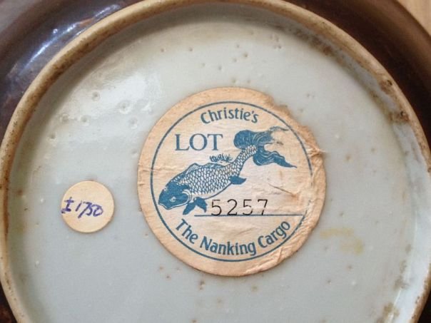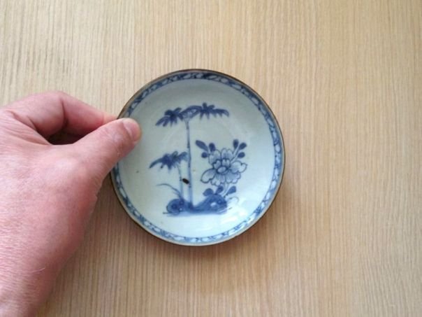 Porcelain saucer decorated in blue and white with Rocks, Bamboo and a Peony blossom. Bamboo (zhu) and Peony (fuguihua) lead to the expression ‘May you have Peace and Prosperity’ (fugui ping’an). The Bamboo symbolizes Peace while the Peony is the flower of Wealth and Rank (or Honor). The Rock in the picture represents Longevity. The back of the saucer is covered in a dark brown glaze and still has a sticker stating that it was auctioned by Christie’s. Originally it was part of a large haul of porcelain which was potted in Jingdezhen, Jiangxi province and then shipped to Nanking for delivery to the Dutch East India Company (VOC) in Indonesia. The Dutch VOC-ship ‘Geldermalsen’ on which the cargo was loaded struck a reef on her return journey to the Netherlands and sank in the South China Sea on January 3, 1752. The cargo was recovered by Captain Michael Hatcher and his team in 1985 and sold by Christie's Amsterdam on 28 April - 2 May 1985 as 'The Nanking Cargo’. Consequently the saucer dates from the Qianlong period (1735 – 1796). There is a black firing spot on the front. Diameter 11.7 cm. Height 2.2 cm.