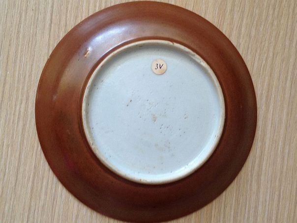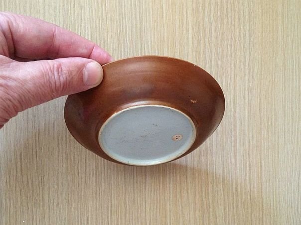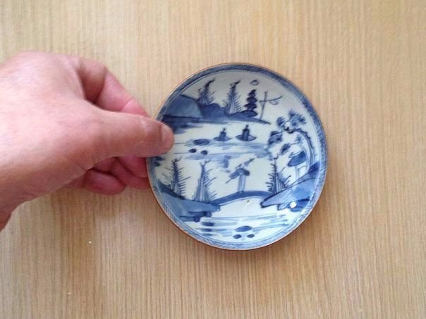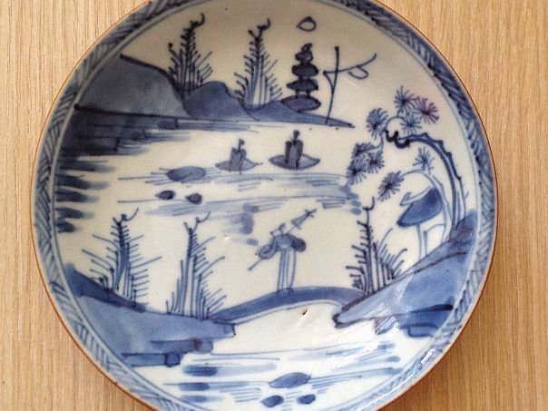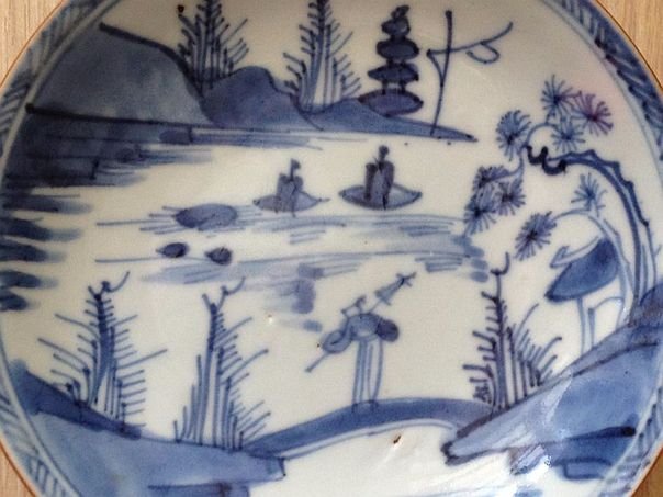 Porcelain saucer decorated in blue and white with a man crossing a bridge in a mountainous landscape. He carries a parasol or umbrella over his shoulder. The back is covered in a brown glaze. The saucer which was made for the export market is in mint condition and dates from the 18th century. Diameter 11.9 cm. Height 2.2 cm.