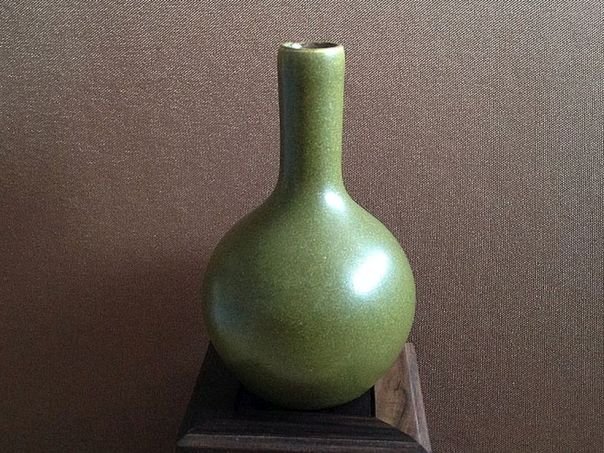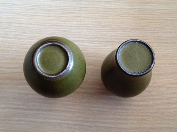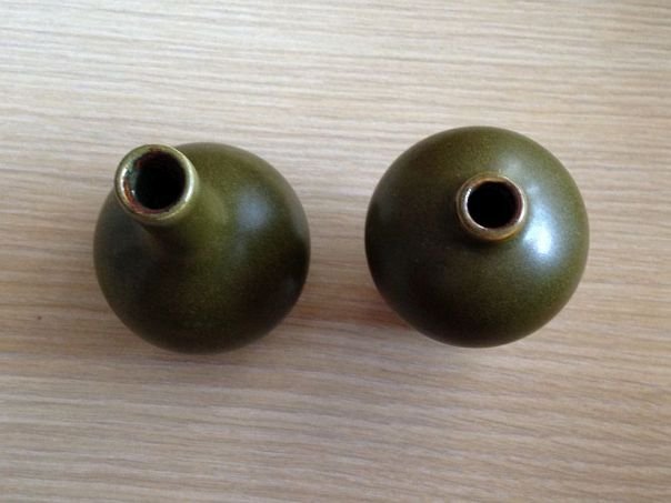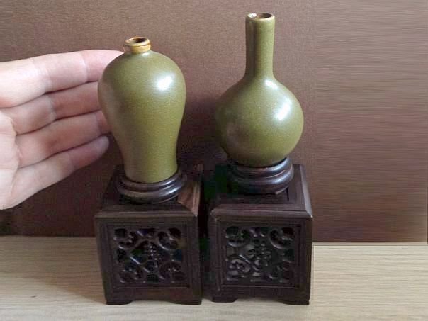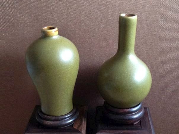 Two very small porcelain vases covered in a glaze which is called ‘tea dust’ in China. Both vases came from a private collection according to the dealer who sold them to us. We do not believe that they are very old and perhaps date from the late Republic period (1912 – 1947) or even later but nevertheless they are pleasing to the eye. Dimensions of the left vase: Height 8 cm. Diameter vase 4.8 cm. Diameter of the foot ring 3.1 cm. Dimensions of the right vase: Height 8.6 cm. Diameter vase 5.2 cm. Diameter of the foot ring 3.1 cm.