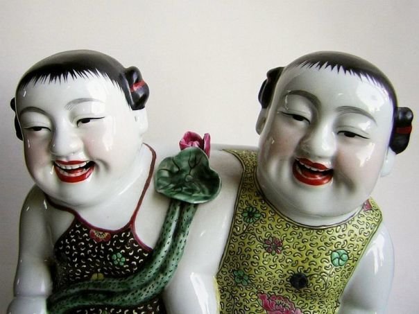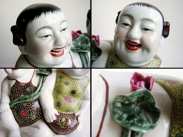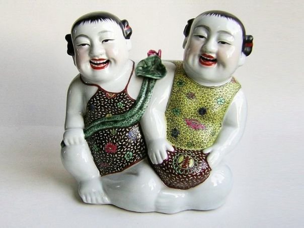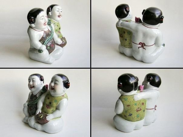 Glazed porcelain depiction of the 'Laughing twins or He He Erxian' who are the Gods of Peace and Harmony. They are dressed in a short undershirt known as a ‘du dou’. One of the twins is called Shi De (拾得) and the other Han Shan (寒山). The twins bestow blessings on marriages. Every time we look at these boys, they make us smile just like the moment when we first saw them. The painting of the glazes is done in detail and the minute decoration of their undershirts, which must have been quite a time-consuming job, incorporates many different auspicious flowers. One boy sticks his hand in a wallet embellished with a longevity character (shou). The wallet symbolizes Wealth. The other boy holds a lotus flower which represents Continuous Harmony. On the bottom is a seal impression Fujian Hui Guan (福建会馆) which was a popular mark during the late Qing (1644 – 1912) and the Republic period (1912 – 1947). Width 18.5 cm. Depth 12 cm. Height 18 cm.