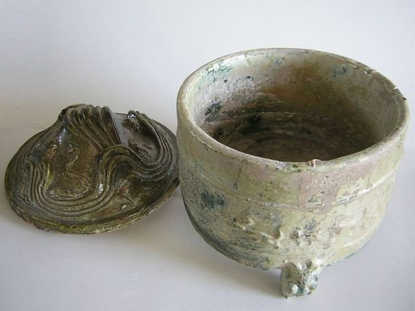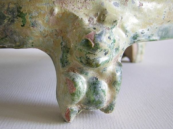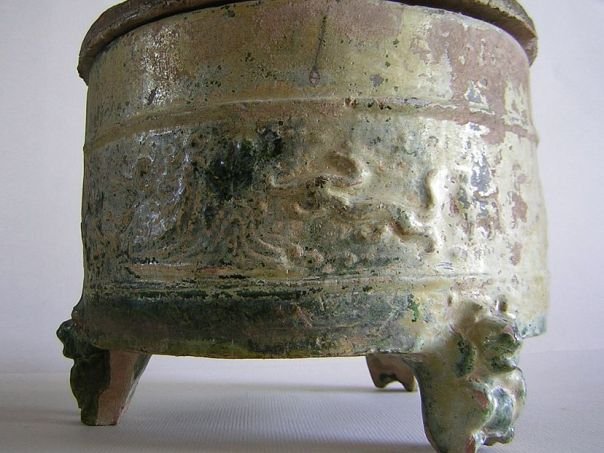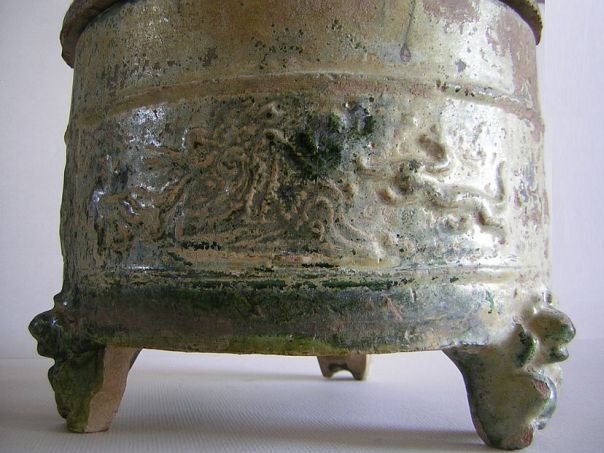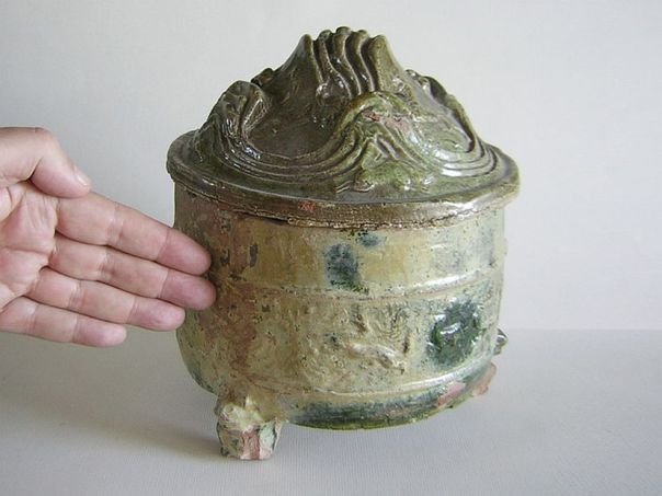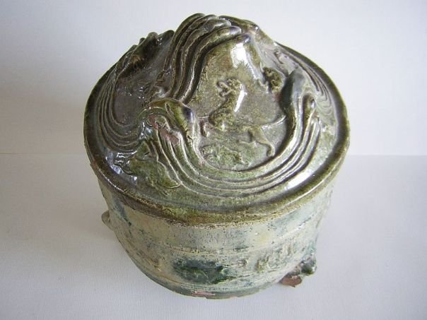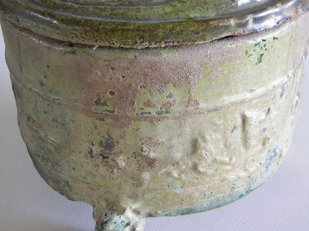 Green glazed ‘Hill jar’ made of red earthenware. The glaze covers the interior of the jar but not the inside of the lid. The glaze has degraded over time and shows some iridescence. The lid depicts a central peak surrounded by lower peaks with animals such as a dragon, a phoenix, pigs, bears and a dog. The body has a molded frieze depicting more beasts in a mountainous landscape. The molding of the body is less sharp than the lid. The bottom is partly glazed and has three feet in the shape of bears. The Hill jar dates from the Eastern Han period (25 - 220 AD). Height 23 cm. Diameter 19.5 cm. THIS ITEM WAS SOLD AT AUCTION IN 2022.