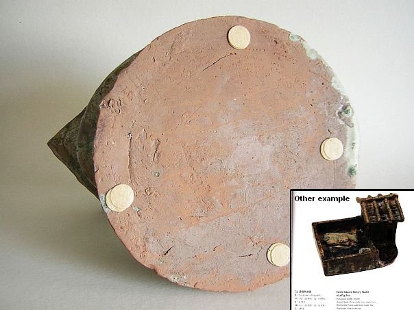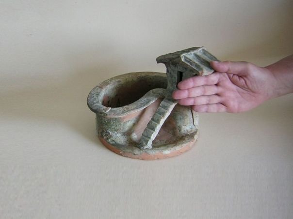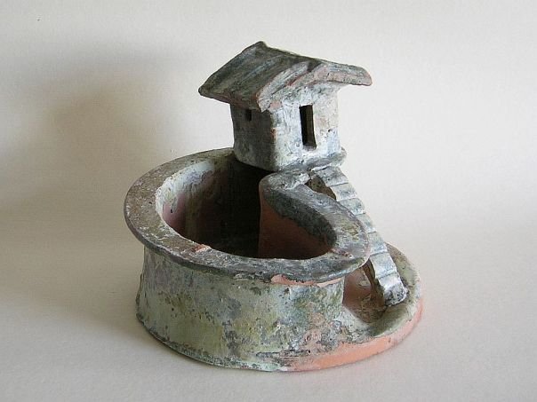 Green glazed pottery miniature model of a pigsty. The little house, accessible by a long staircase, is in fact a latrine and the ‘droppings’ would fall down into the pigsty. Such miniature models were meant to be used during the ‘afterlife’. It dates from the Eastern Han period (25 – 220AD) when models of pigsties were customary as tomb gifts. Height 18 cm. Length 28 cm. Width 22 cm. Diameter bottom 22 cm. THIS ITEM WAS SOLD AT AUCTION IN 2022.