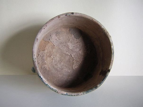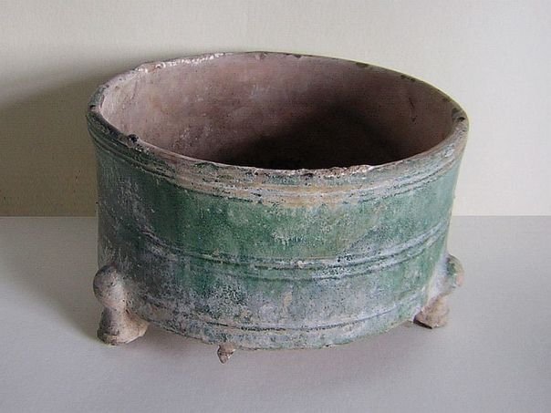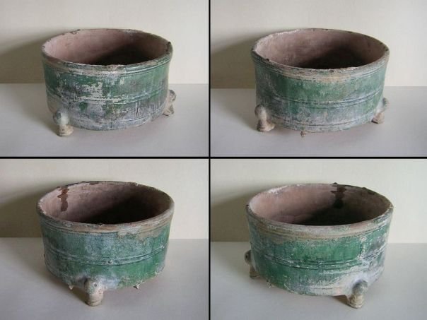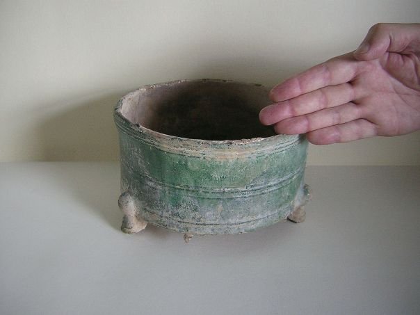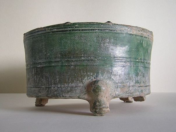 Green glazed pottery jar with three feet which are supposed to represent squatting bears. The details of those bears are however rather crudely modeled. Jars like this were modeled after bronze ones which were used to warm and serve wine. It dates from the Han period (206BC – 220AD). Diameter 22 cm. Height including feet 12.3 cm. Height excluding feet 10 cm. THIS ITEM WAS SOLD AT AUCTION IN 2022.