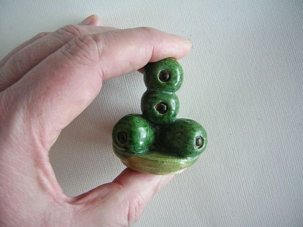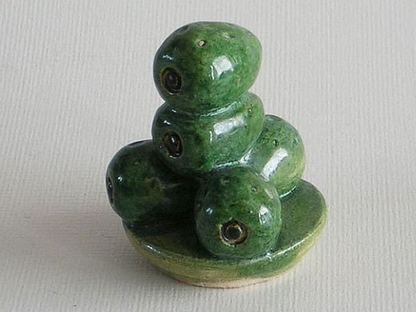Green glazed offering which would have been placed on an altar table. The fruits are unknown to us. In the Lowlands-collection are a large number of such offerings. The glaze of this one is almost like new. Ming dynasty (1368 - 1644). Diameter dish 4.6 cm. Height 5.7 cm. This item was sold at auction in 2022.