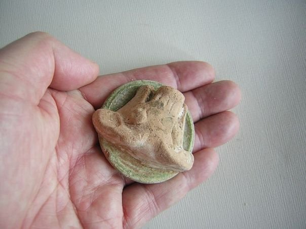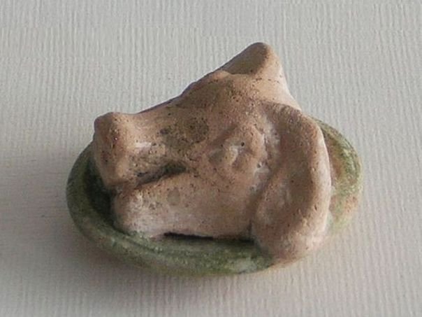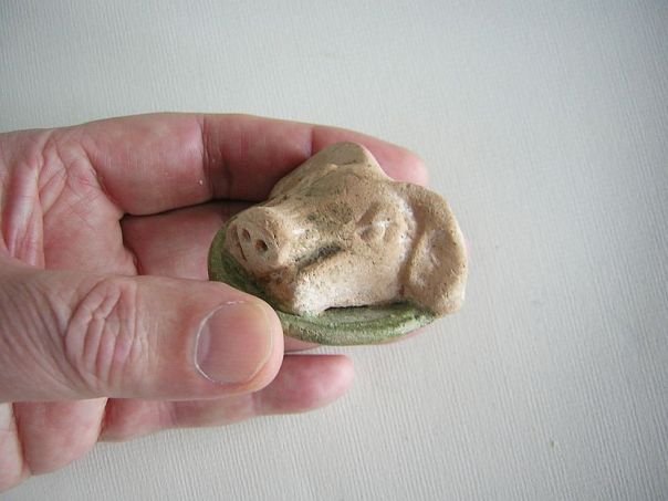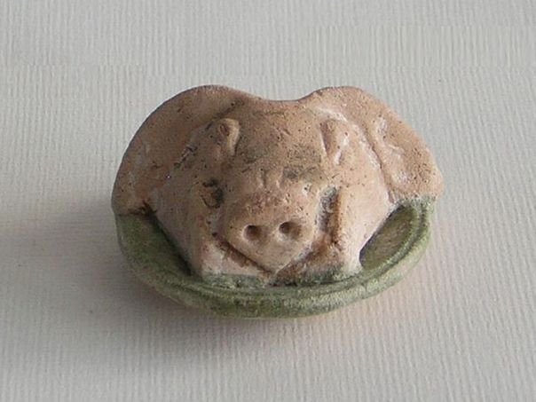 Partly green glazed and partly cold painted offering dish with a pig’s head on it. This miniature dates from the Ming period (1368 - 1644). Diameter dish 5.3 cm. Height 2.8 cm. This item was sold at auction in 2022.