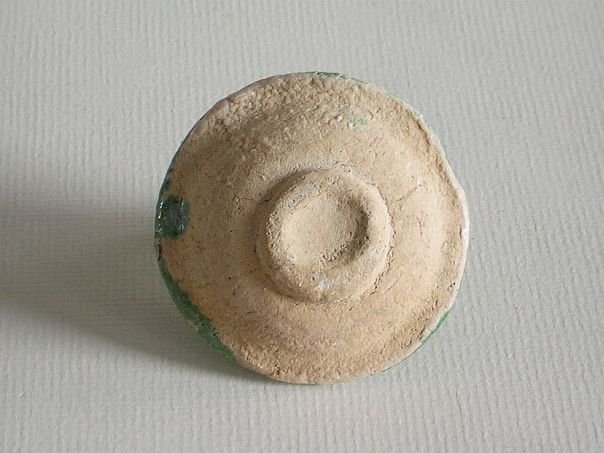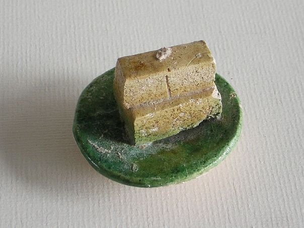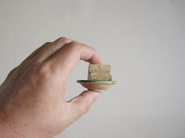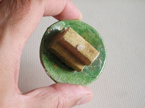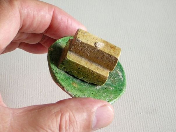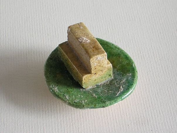 Miniature green glazed pottery dish with three rectangular straw-glazed food items. We have a number of the same food items in the Lowlands-collection. One is crème-glazed. Are these blocks of tofu, or bread, or cake? Miniature pottery foodstuffs were often placed on a table together with other food items which makes us believe that they were offerings. This one dates from the Ming period (1368 – 1644). Diameter dish 5.3 cm. Height including food 3.8 cm. This item was sold at auction in 2022.