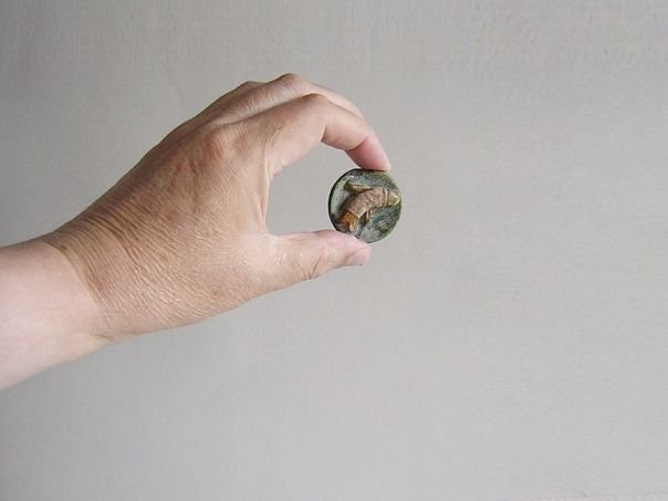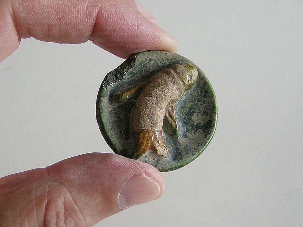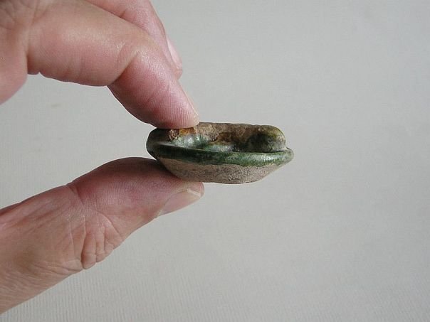 Miniature dark green and brown glazed dish with a small fish. Objects such as this were often placed on a miniature pottery table together with other food items which makes us believe that they were offerings. Fish were considered as symbols of Abundance. Regrettably the saucer has a chip. It dates from the Ming period (1368 – 1644). Diameter dish 3.8 cm. Height including fish 1.5 cm. This item was sold at auction in 2022.