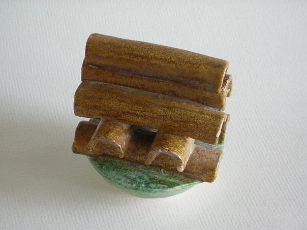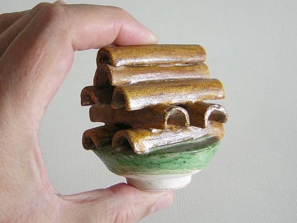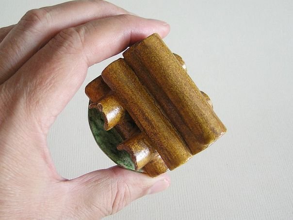 Miniature green and amber glazed pottery food item. We have no idea what kind of food this is. The shape of the individual items resembles a roof tile so we assume that it is something that was baked. The object dates from the Ming period (1368 – 1644). Diameter saucer 6.2 cm. Length food 5.8 cm. Height including food 6.9 cm. This item was sold at auction in 2022.