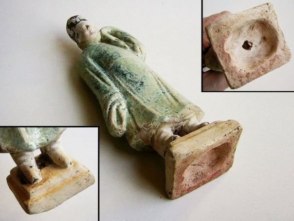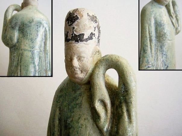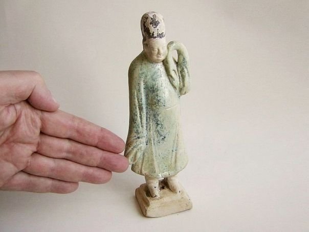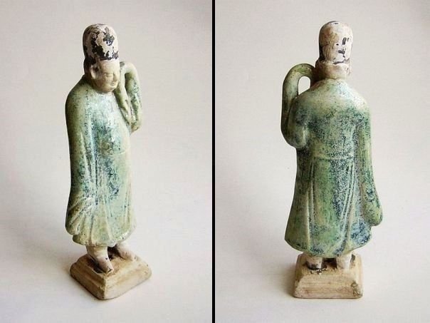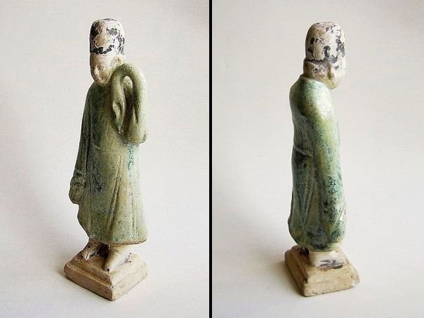 Partly glazed funerary figure of a sedan chair bearer. He is recognizable as a bearer because one of the two poles of the sedan chair could be inserted on his left shoulder. Often sedan chairs, carried by four bearers form part of a group of musicians and dignitaries which accompanied the deceased to the afterlife. The glaze is still in fine condition and shows lots of iridescence but most of the color on his cold-painted face and hat have been washed off. The bearer dates from the Ming dynasty (1368 – 1644). Height 19.8 cm. Width 5.1 cm. Depth 4.6 cm.